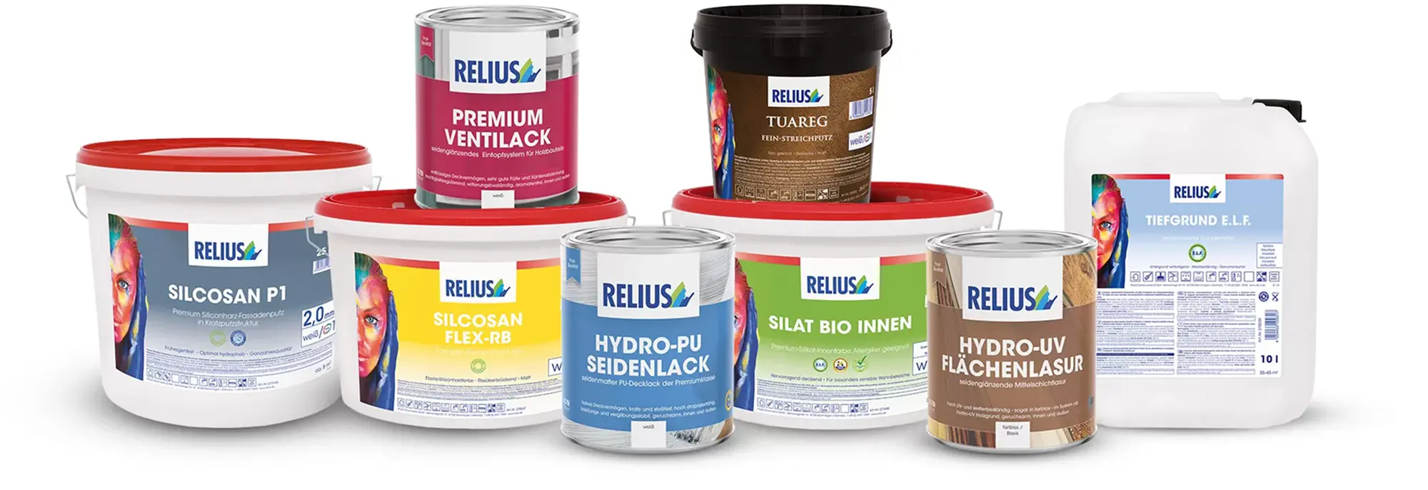 Het omvangrijke assortiment van RELIUS bevat producten, systemen en probleemoplossingen met uitstekende professionele kwaliteit in de bereiken bouwlakken waterverdunbaar en met oplosmiddel, waterverdunbare houtbescherming en met oplosmiddel, binnenverven, buitengevelverven, dakverflagen, gevel- en binnenpleisters, plamuren, vloerverflagen, kleefstoffen, afdichtmassa‘s en hulpstoffen, wandbezettingen, isolatie (buitengevel- en binnenisolatie) en creatieve systemen.