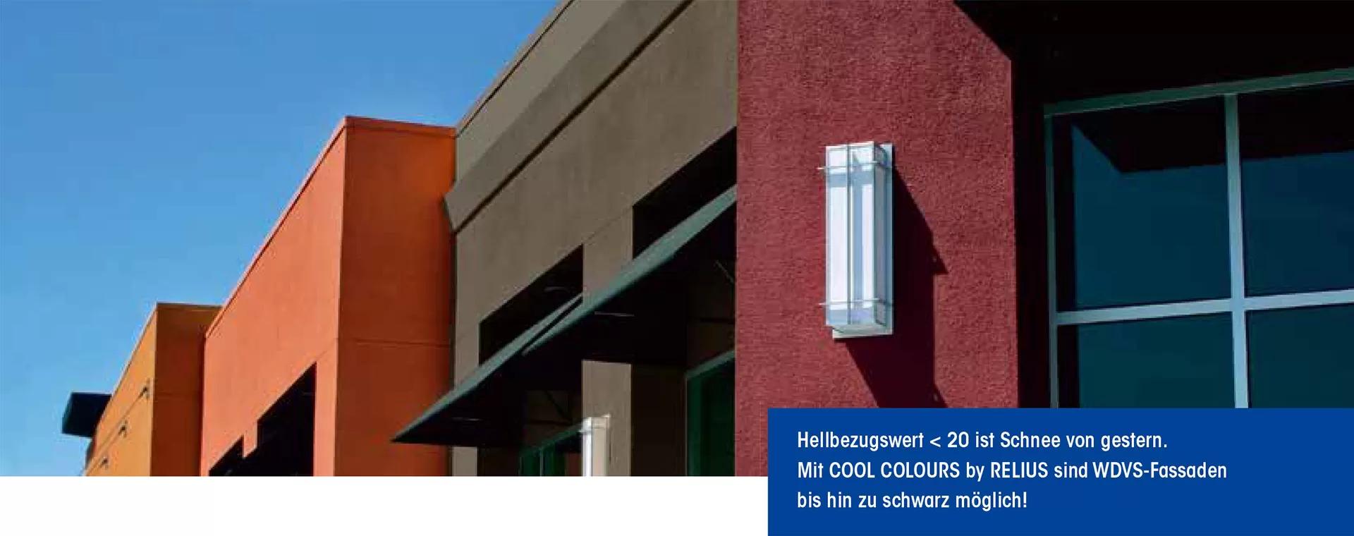 Ob bei der Renovierung vorhandener WDVS oder ihrer Neuerstellung – es genügt ein zweifacher Anstrich mit der Fassadenfarbe RELIUS RELINOVA NANO TECH, ausgestattet mit der Technologie COOL COLOURS by RELIUS, um die Gefahr von zu hoher thermischer Bewegung, verformung oder Rissbildung zu bannen. Dabei braucht man keine Rücksicht mehr zu nehmen auf Hellbezugswerte. Mit der neuen Technologie sind auch trendige Fassaden in kräftigen Farben bis hin zu schwarz sicher möglich.