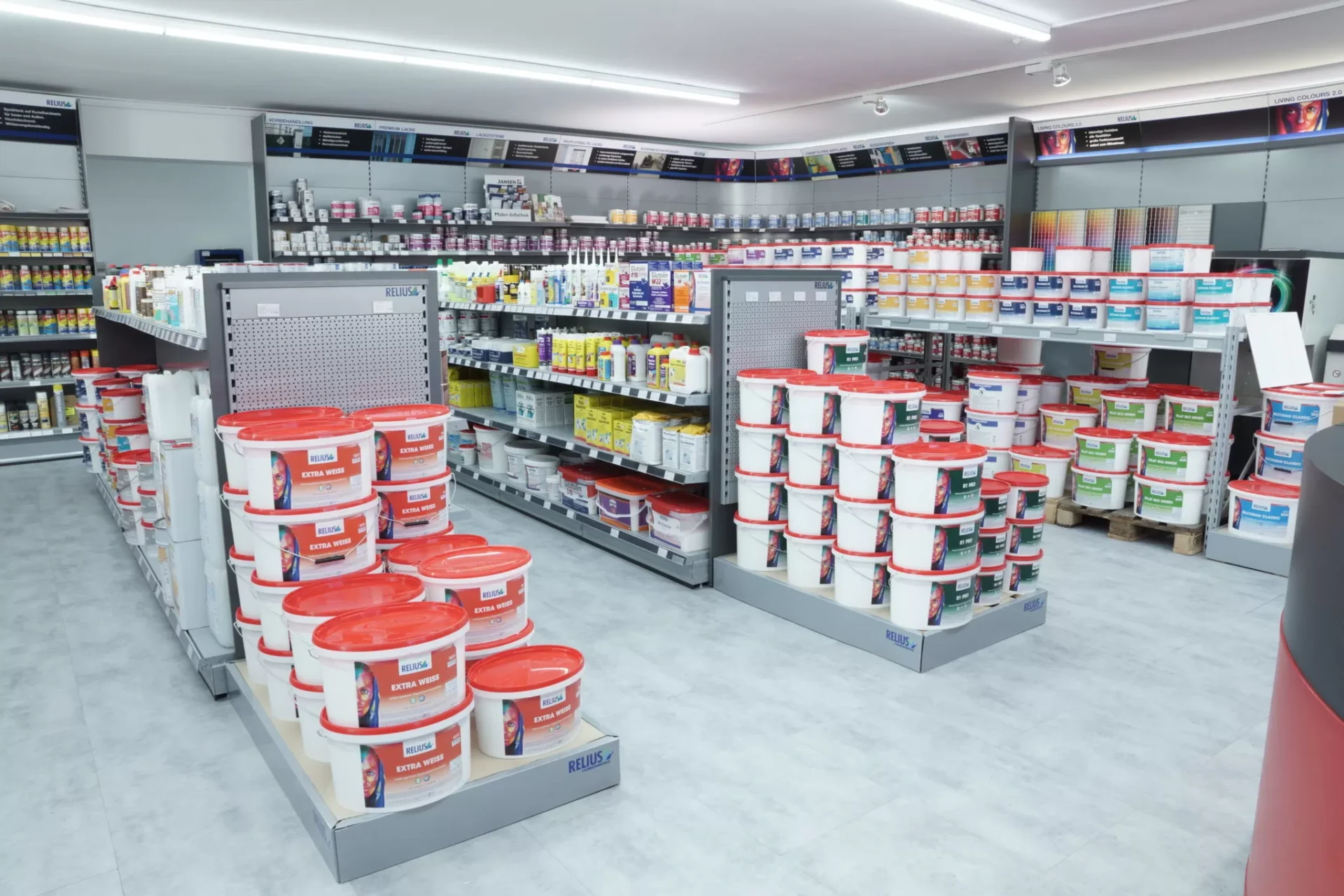 Ein durchdachtes Ladenbaukonzept leistet einen wichtigen Beitrag zum Geschäftserfolg. RELIUS ermittelt gemeinsam mit dem Fachhändler die spezifischen Voraussetzungen in einer individuellen Analyse und bietet die Ladenausstattung für das komplette RELIUS Sortiment – vom einzelnen Regalmodul bis zur kompletten Ladeneinrichtung, von der Beschilderung bis zur Schaufenster-Dekoration.
